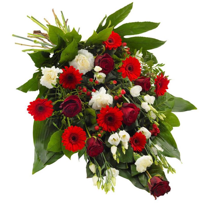 Róża bordowa + Gerbera czerwona + Goździk kremowy + Eustoma biała + Liście + Dodatki