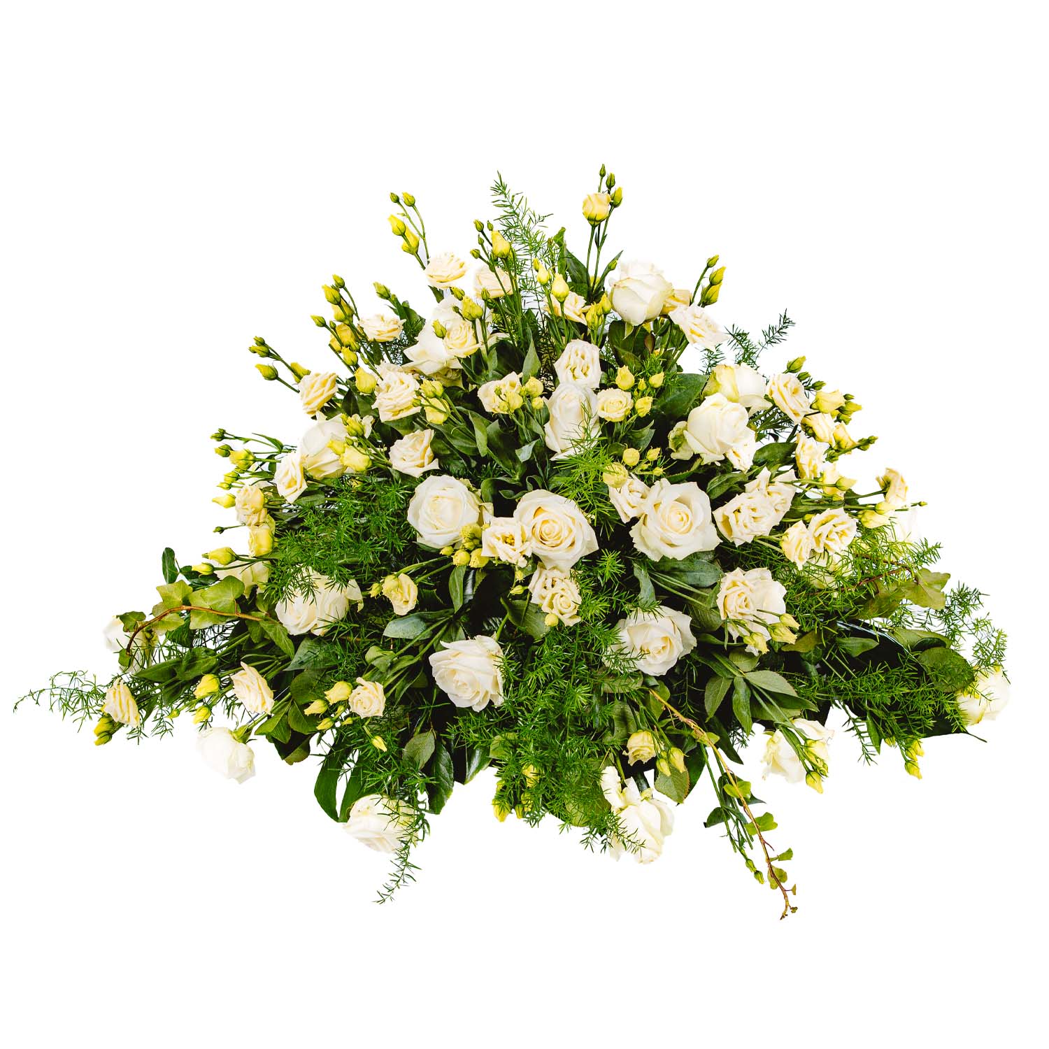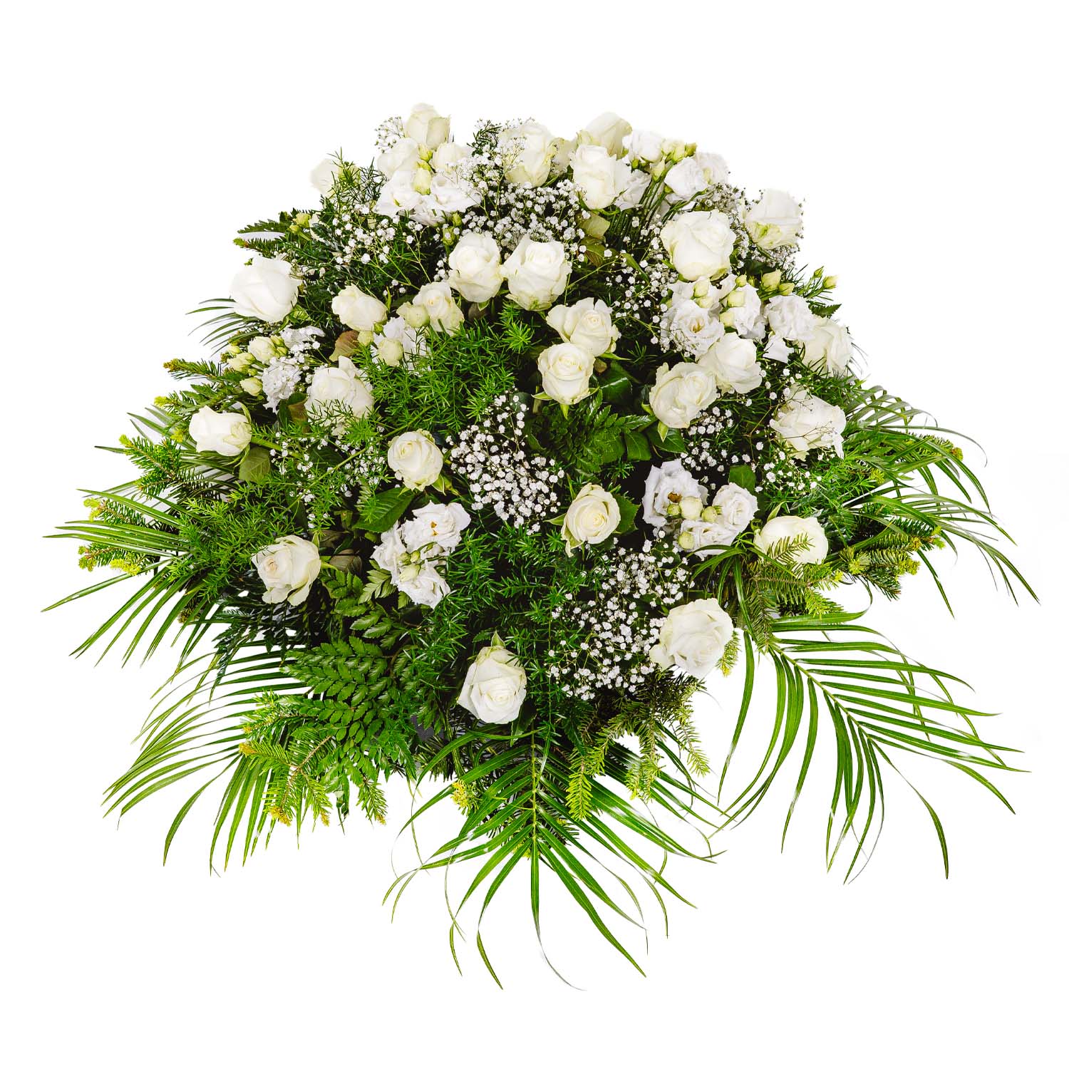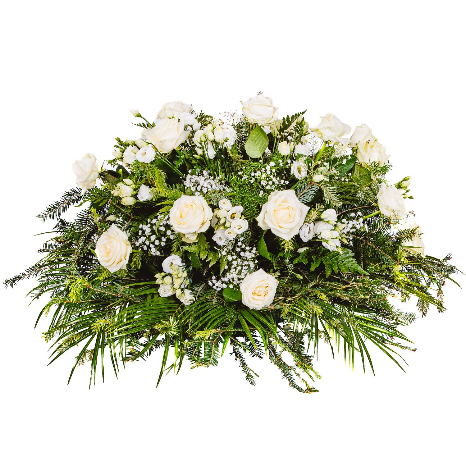 Róża biała + Eustoma biała + Gipsówka + Asparagus + Liście + Jodła