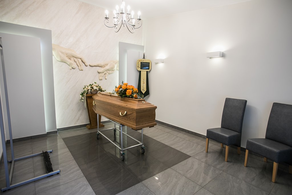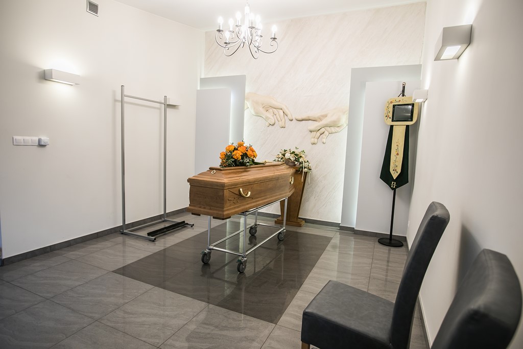Na terenie cmentarza Ewangelicko-Augsburskiego przy ul. Ogrodowej 43 znajduje się kameralna sala pożegnań, stworzona z myślą o spokojnych i osobistych chwilach rozstania z bliską osobą. Jej jasne wnętrze, utrzymane w tonacji beżu i szarości, sprzyja wyciszeniu i refleksji.