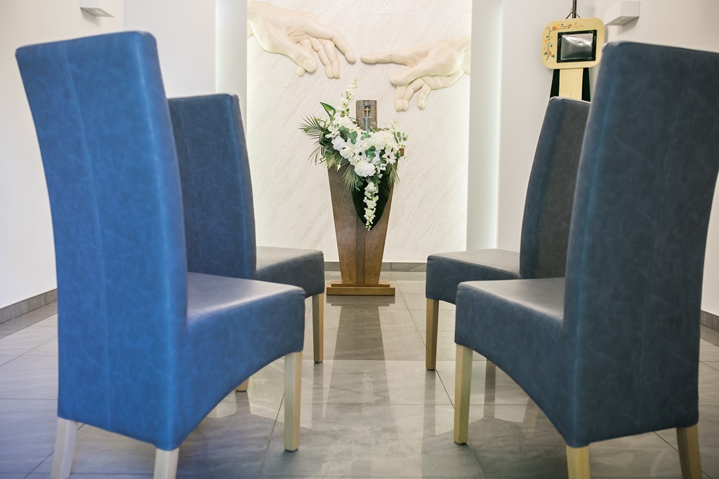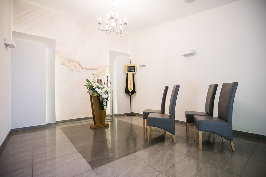 Stonowana kolorystyka oraz minimalistyczna estetyka wnętrza tworzą atmosferę ciszy, zrozumienia i duchowego spokoju. Sala stanowi miejsce, w którym Rodziny mogą przeżyć pożegnanie w godny sposób – z szacunkiem, zadumą i wzruszeniem.