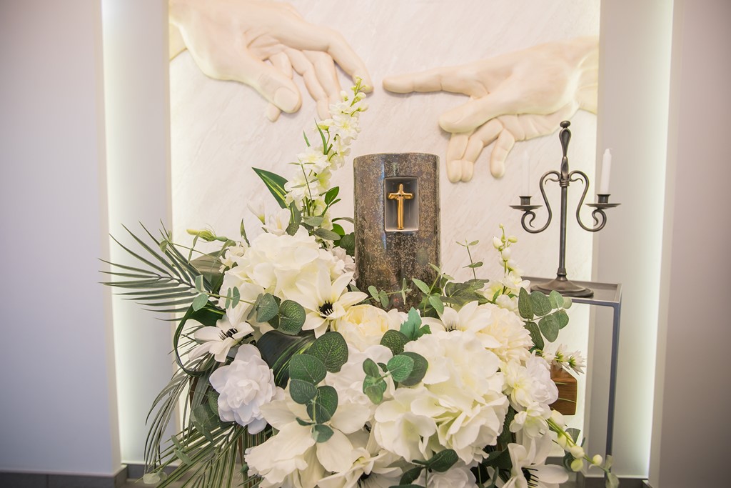 Centralnym elementem przestrzeni jest frontowa ściana zdobiona motywem dwóch dłoni, nawiązującym do fresku „Stworzenie Adama”. Ten symboliczny detal przywołuje ideę bliskości, życia i duchowego kontaktu, podkreślając wyjątkowość momentu pożegnania.